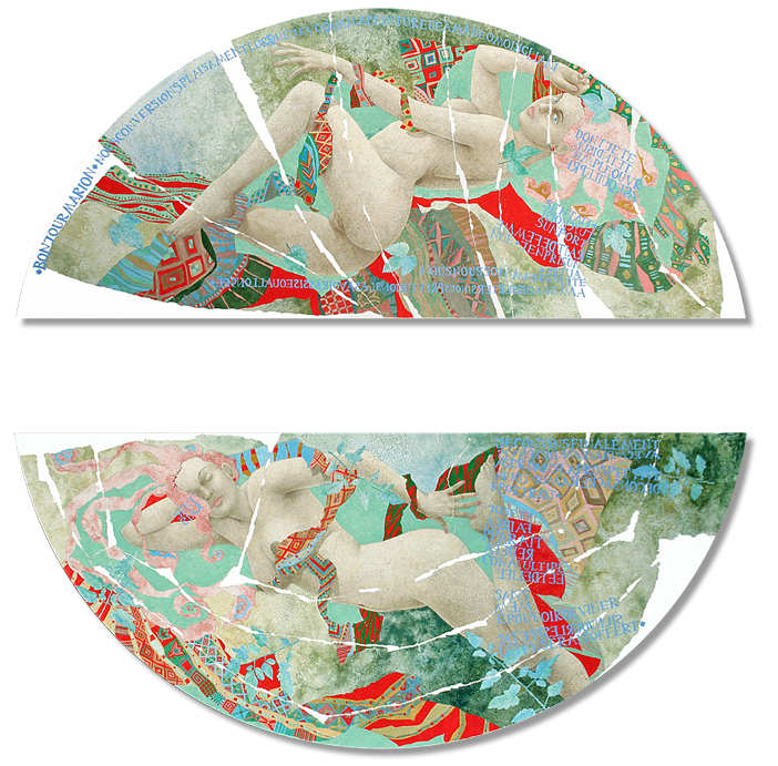 a nudité de ses créatures voluptueuses et diaphanes subit la métamorphose de son exercice premier : matériau de peintre ou ciment craquelé, empreintes de feuilles d'arbres parant les corps, le tout est travaillé d'abord sur papier puis refaçonné et remodelé sur la toile. Les corps tronqués et reconstitués sont traversés de déchirures blanches en zones de silence où la vie, mystérieuse, se réanime.