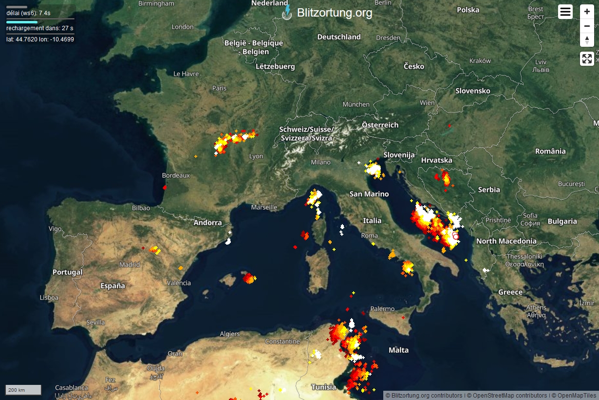 • Impacts de foudre en temps réel sur l'ensemble du Globe terrestre : Orages en cours