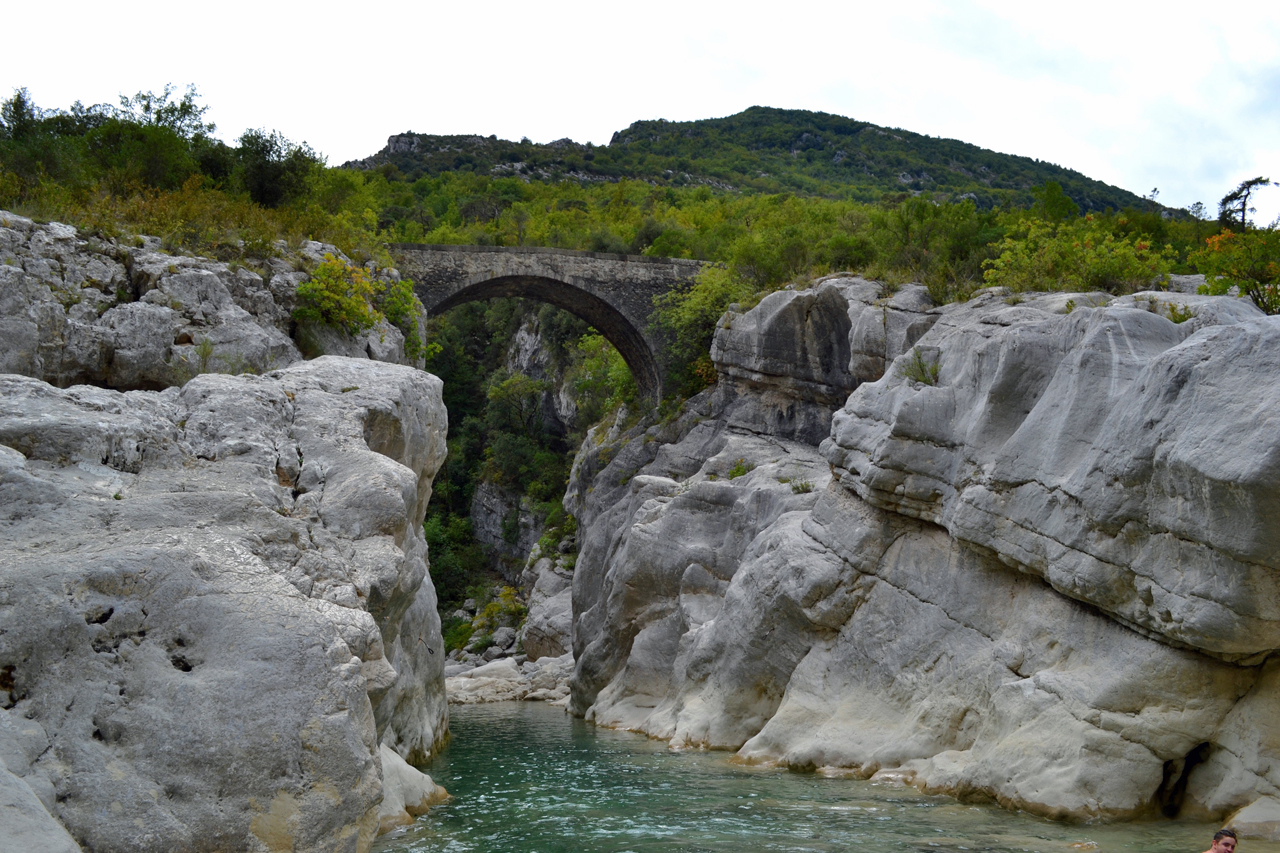 Le Pont de la Cerise qui enjambe sa clue (du provençal cluse, du latin clusa, gorge, défilé) aurait pu être bâti plus bas sur la dalle rocheuse comme le révèle les images suivantes, certes mais on lui préféra une "altitude" très prudente car sa clue est particulièrement encaissée, resserrée. Les exemples sont multiples où de tels enjambements sont hauts dans les Vallées profondes des Alpes-maritimes ...