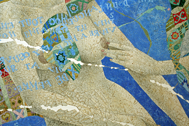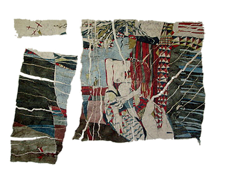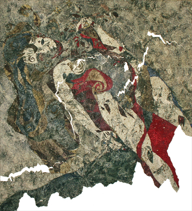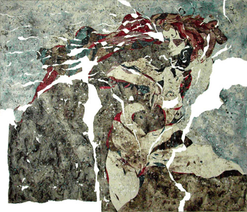 se superposer aux corps nus et de jeter sur eux une ombre souvent diaphane. Alors que la présence d'empreintes végétales réinventées et peintes subissent le même procédé, on peut découvrir dès les oeuvres de 1991 l'évocation certes tronquée de paysages quand les fonds colorés, granuleux, rupestres introduisent le concept d'un étrange temps passé, réanimé, remodelé par la main et l'esprit de l'artiste.